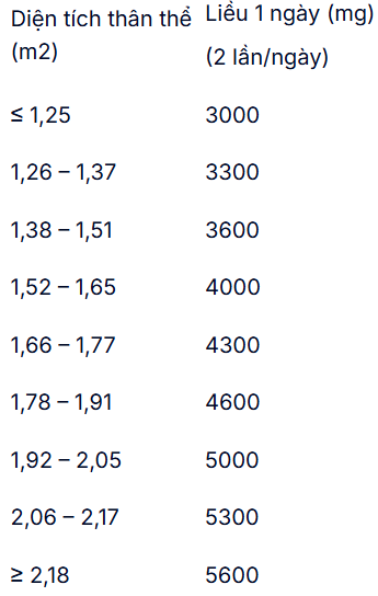 - Liều ban đầu là 1250 mg/m2/lần, 2 lần/ngày, trong 2 tuần; sau đó nghỉ dùng 1 tuần.