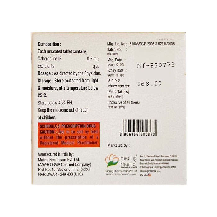 Ở chuột, cabergoline và/hoặc các chất chuyển hóa của nó được bài tiết qua sữa. Không có thông tin về sự bài tiết qua sữa mẹ ở người, tuy nhiên, sự tiết sữa được cho là sẽ bị ức chế hoặc kìm hãm bởi cabergoline.