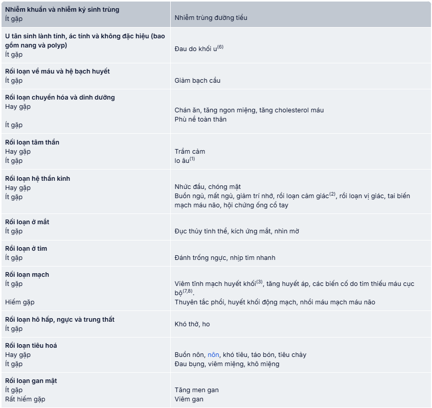 Nói chung về bản chất, các phản ứng bất lợi quan sát được chủ yếu là nhẹ hoặc trung bình, và hầu hết có liên quan với sự thiếu estrogen.