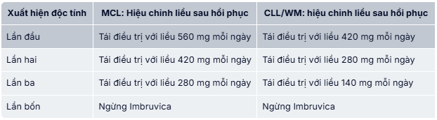 Nên tạm ngừng điều trị với Imbruvica khi có bất kỳ khởi phát mới hoặc tiến triển xấu đi của độc tính không phải huyết học độ ≥ 3, giảm bạch cầu trung tính có nhiễm trùng hoặc sốt ≥ độ 3, hoặc độc tính huyết học độ 4. Khi triệu chứng độc tính được giải quyết về độ 1 hoặc độ ban đầu (phục hồi) thì có thể tái điều trị Imbruvica với liều khởi đầu. Nếu độc tính tái phát, liều một lần mỗi ngày nên giảm đi một viên (140 mg). Nếu cần thiết nên cân nhắc giảm thêm một viên 140 mg. Ngừng điều trị nếu độc tính còn dai dẳng hoặc tái phát sau hai lần giảm liều.