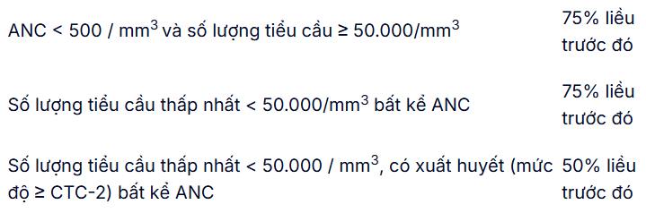 - Điều chỉnh liều: Điều chỉnh khi bắt đầu chu kỳ điều trị tiếp theo, nên dựa trên kết quả xét nghiệm kiểm tra công thức máu (số lượng bạch cầu đa nhân trung tính (ANC), số lượng tiểu cầu thấp nhất) hoặc độc tính tối đa không liên quan đến huyết học từ chu kỳ điều trị trước đó. Việc điều trị có thể trì hoãn để bệnh nhân có đủ thời gian hồi phục.