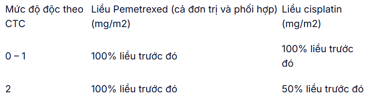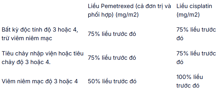 - Nếu độc tính không liên quan đến huyết học ≥ Độ 3 (không bao gồm độc tính thần kinh). Pemetrexed nên được tạm dừng đến khi giảm mức độc tính thấp hơn hoặc tương đương với giá trị trước khi điều trị của bệnh nhân.