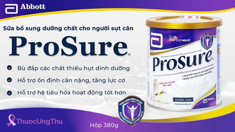 Điều trị ung thư là một quá trình kéo dài, cần kết hợp rất nhiều biện pháp khác nhau. Bên cạnh việc ăn uống đầy đủ các loại thực phẩm thuộc các nhóm chất đạm, chất béo, vitamin, bột đường, khoáng chất, rèn luyện thể thao,... Người mắc bệnh cũng có thể xin tư vấn của bác sĩ để được sử dụng 1 số loại thực phẩm tăng cường. Một trong số những loại sản phẩm mang lại hiệu quả đặc biệt đối với bệnh nhân sụt cân do ung thư hay bất cứ căn bệnh nào khác là Sữa Prosure hương Vani. Sản phẩm được nghiên cứu lâm sàng, cung cấp nguồn dinh dưỡng dồi dào giúp tăng thể trọng, sức khỏe, tăng cường khả năng hoạt động và chất lượng cuộc sống.