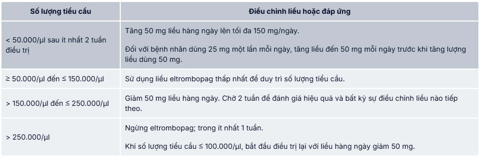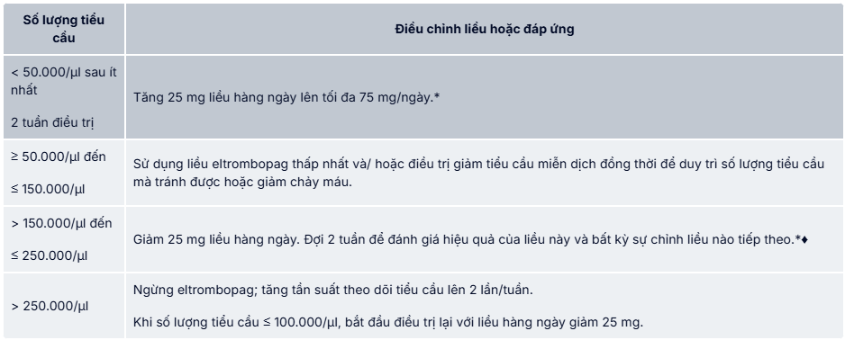 Đáp ứng về huyết học đòi hỏi phải chuẩn độ liều, thường lên đến 150 mg và có thể mất đến 16 tuần sau khi bắt đầu sử dụng eltrombopag (xem phần Nghiên cứu lâm sàng). Nên điều chỉnh liều eltrombopag theo mức tăng 50 mg mỗi 2 tuần khi cần thiết để đạt được số lượng tiểu cầu mục tiêu ≥ 50.000/µl. Đối với bệnh nhân dùng 25 mg, 1 lần/ngày, nên tăng liều lên 50 mg/ngày trước khi tăng liều 50 mg. Không được vượt quá liều 150 mg/ngày. Nên theo dõi thường xuyên xét nghiệm lâm sàng về huyết học và gan trong suốt quá trình điều trị bằng eltrombopag và điều chỉnh phác đồ liều dùng của eltrombopag dựa trên số lượng tiểu cầu như được nêu trong Bảng dưới.
