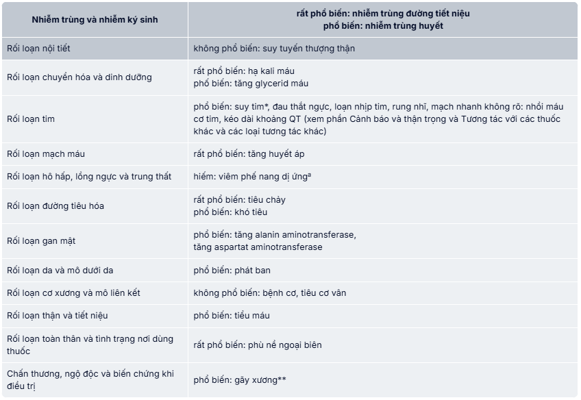 Các phản ứng bất lợi thường gặp nhất là phù ngoại biên, hạ kali máu, tăng huyết áp, nhiễm trùng đường tiết niệu.